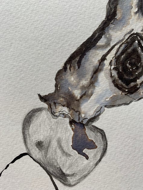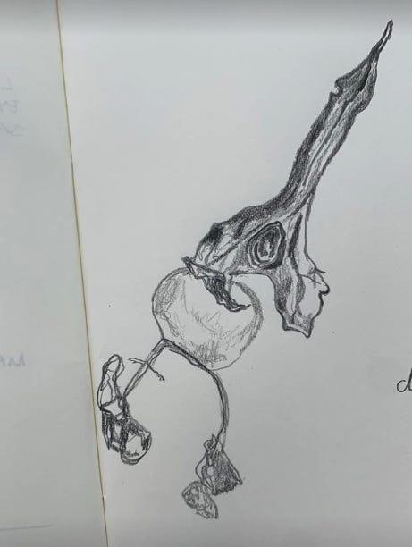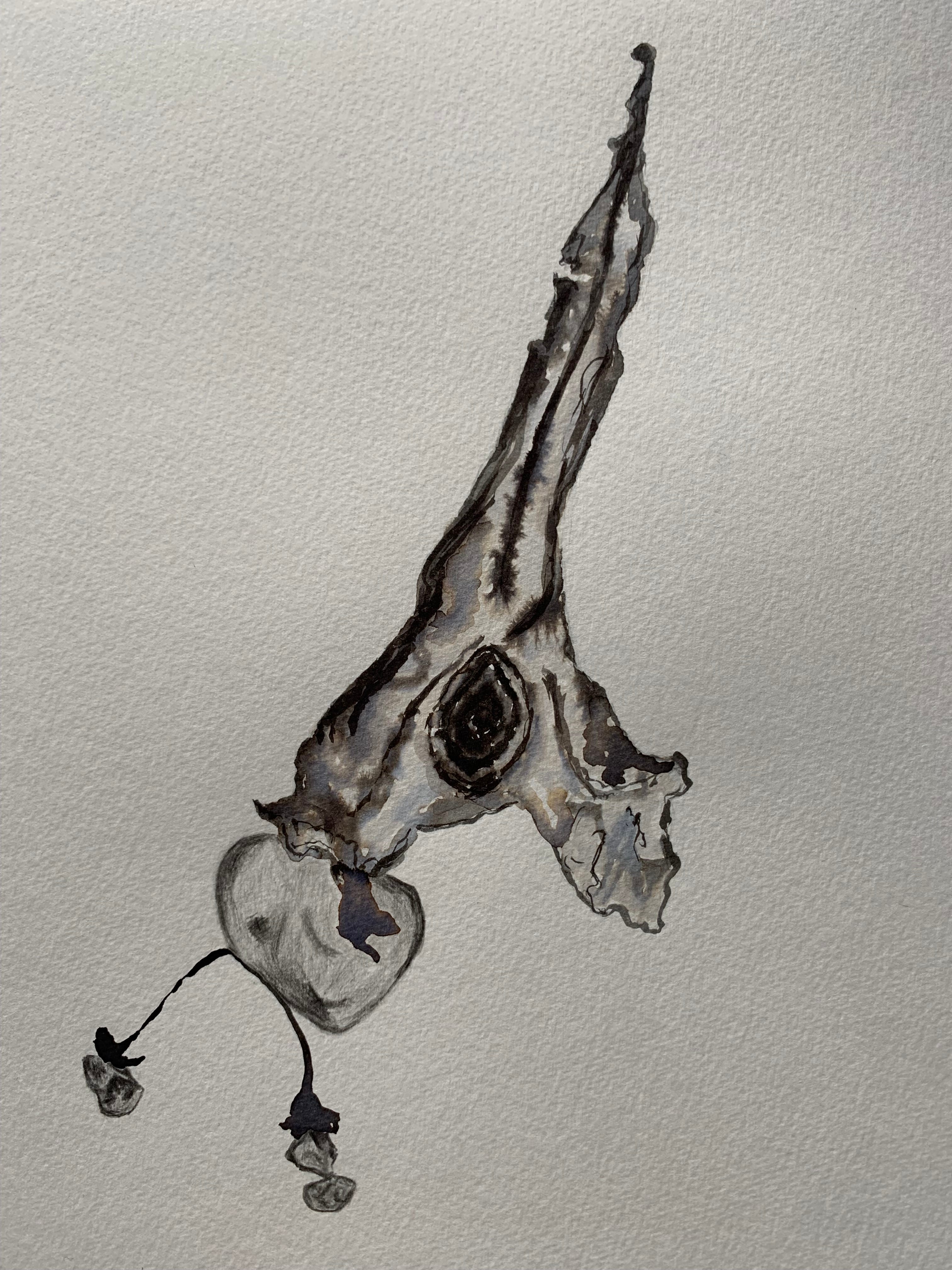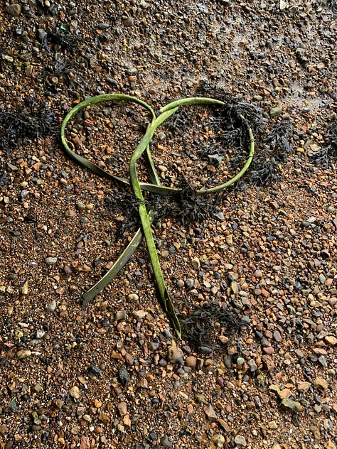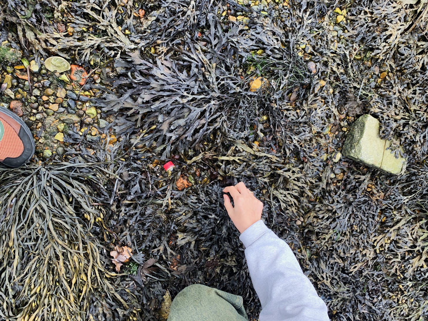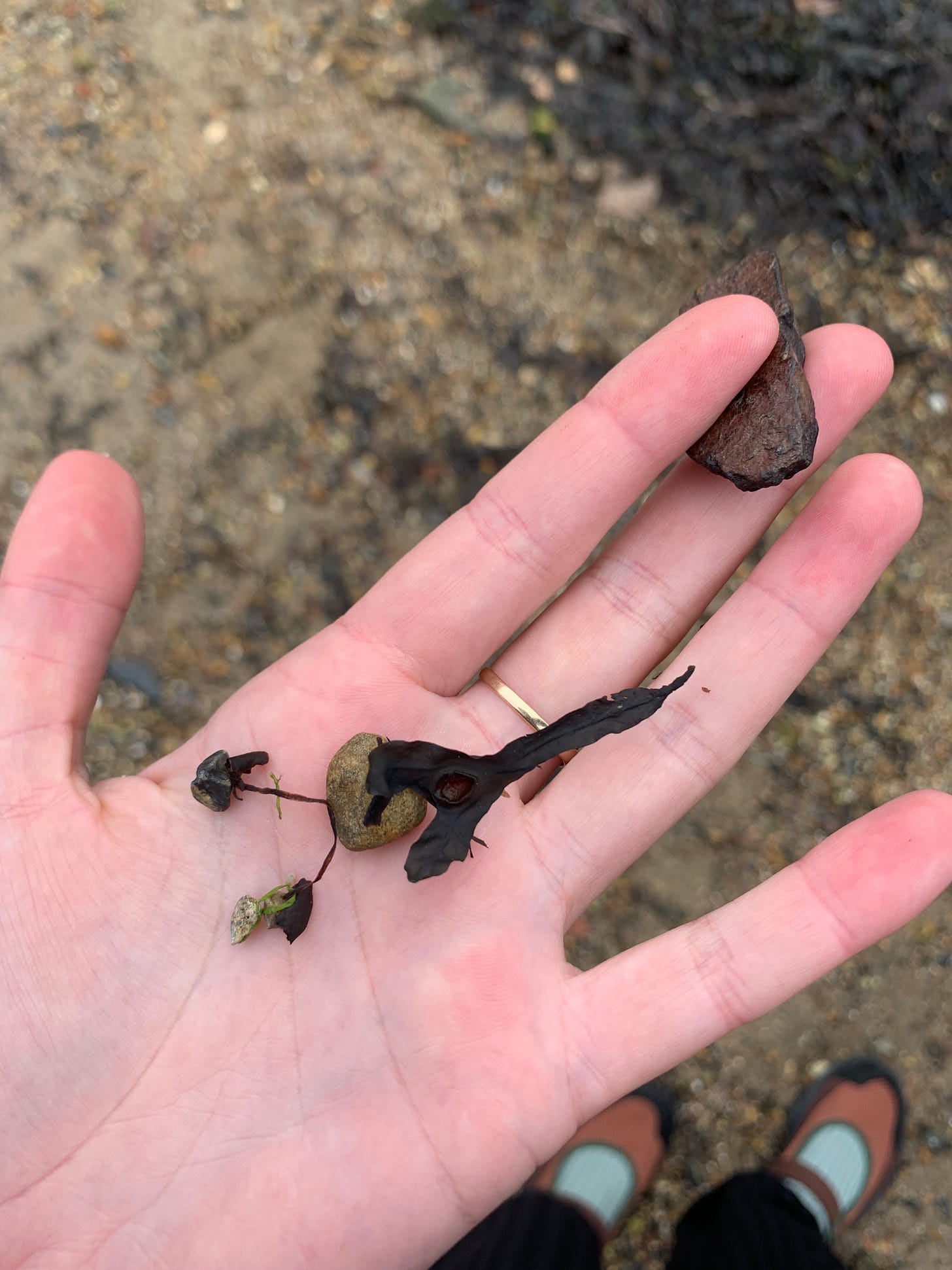 i was really drawn to this tiny piece of seaweed which was holding onto a small stone, with two more strands of seaweed attached to that, each holding onto a couple of even smaller stones. this resembled to me a visual association with clitoral diagrams, but also an ambiguous/hybrid reproductive system.