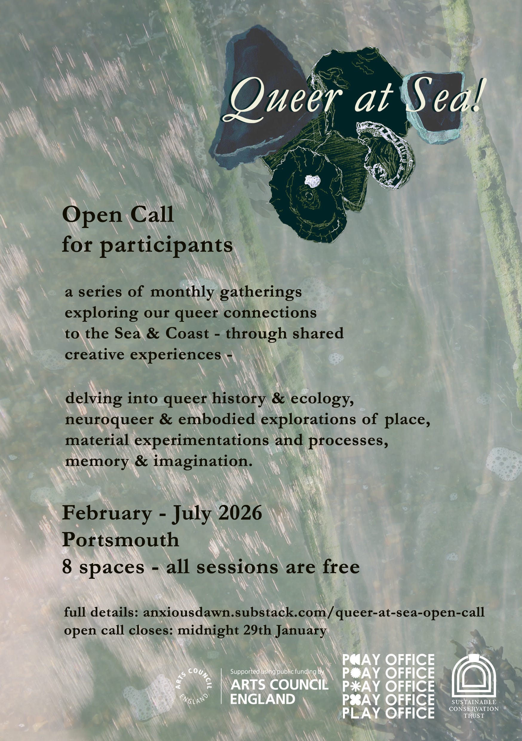 Open call for participants for a series monthly gatherings in the form of creative workshops & socials, exploring our queer connections to the sea and coast, in Portsmouth (Feb - July 2026)
