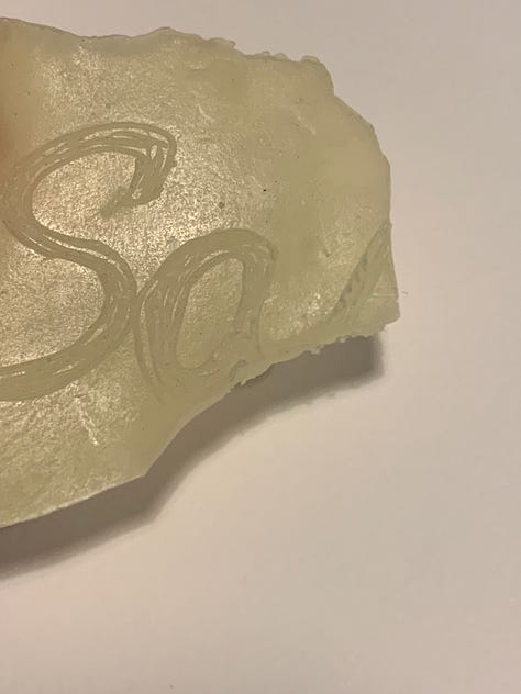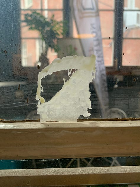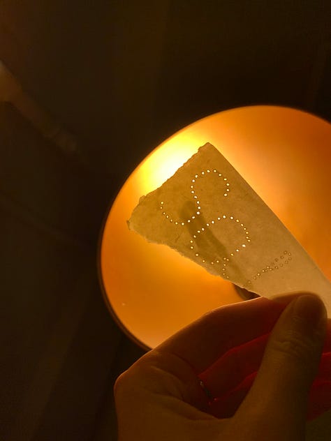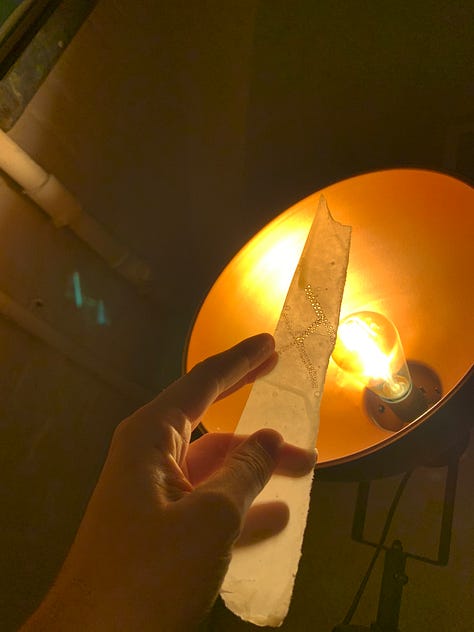 using beeswax melted over a stove in a pot of boiling water, i dipped different papers into the hot wax to try and recreate a horn like texture. once cool and set, i began piercing into the wax paper to create letters and words and imagery of the netting.